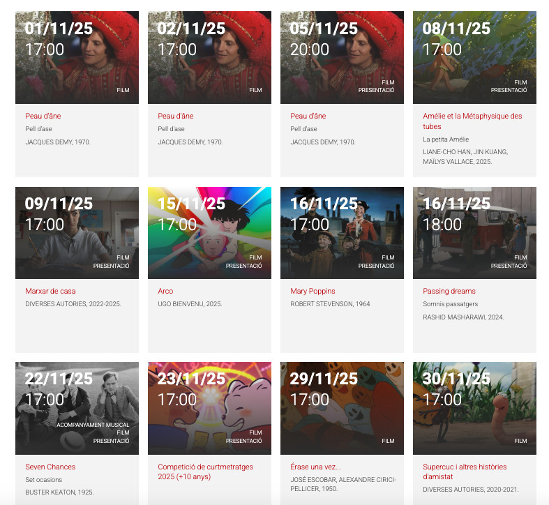Chaque trimestre, retrouvez des cycles de films de différentes époques et cultures, accompagnés d’ateliers, présentations et concerts. En automne, la FilmoXica met à l’honneur les histoires écrites, et la Filmoteca accueille également El Meu Primer Festival et le ReTeena, des événements audiovisuels pour les jeunes.