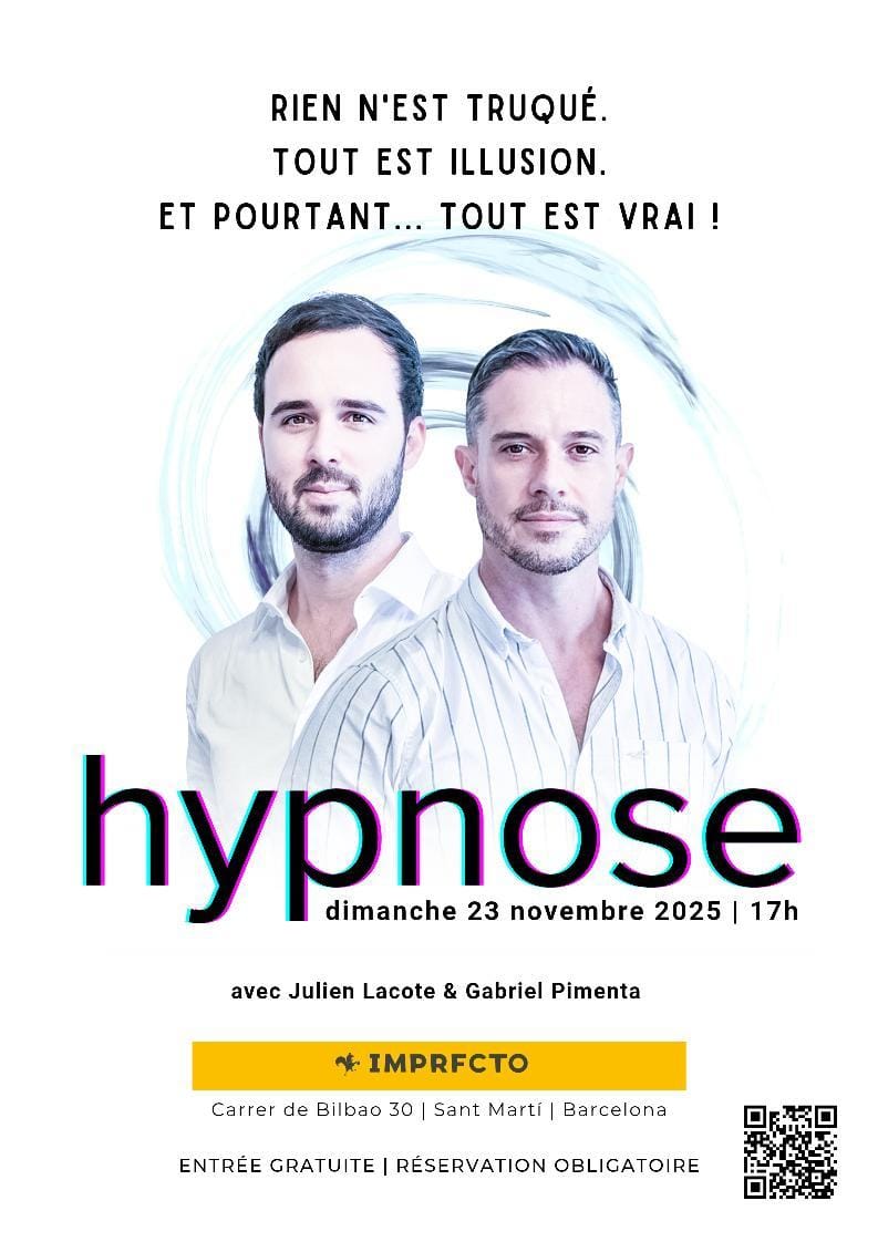 Pendant 1 heure, Gabriel Pimenta et Julien Lacote vous proposent une animation participative pour découvrir l’hypnose de l’intérieur. Testez votre réceptivité, explorez des phénomènes hypnotiques étonnants, comprenez comment votre cerveau crée et défait ses propres illusions, et via une expérience guidée, ludique et bienveillante !